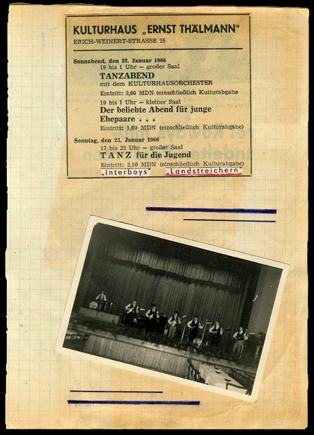 Gemeinsamer Tanzabend mit den Magdeburger "INTERBOYS" und nach dieser berühmt - berüchtigten "Randale" leider auch die letzte Veranstaltung im AMO-Kulturhaus, - lange Zeit für sogenannte "Gitarrengruppen". Während des laufenden Auftrittes wurde von der zunehmend verunsicherten Leitung des Kulturhauses die elektrische Spannung für die Verstärker-Anlagen sowie das Licht auf der Bühne abgeschaltet und der Vorhang zugezogen. Eine Fortsetzung des Tanzabends wurde nach einem Pfeifkonzert und Glasbruch im Publikumsraum nur noch dem hauseigenen Kulturhausorchester gestattet.